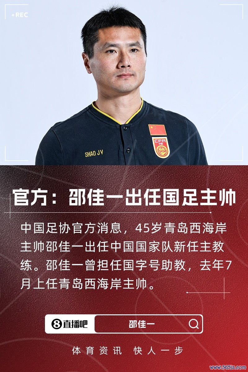 11月05日讯 中国足协官方消息,45岁青岛西海岸主帅邵佳一出任中国国家队新任主帅。