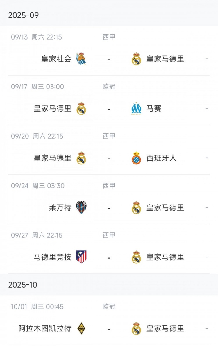 最后两场则是重头戏。首先是9月27日的马德里德比,对手是马竞。随后皇马需要远征8000公里外的哈萨克斯坦,于10月1日与阿拉木图凯拉特进行欧冠小组赛第2轮的对决。