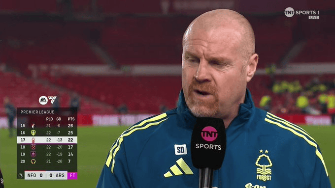 虎扑01月18日讯诺丁汉森林主指导教练员肖恩-戴奇在0-0战平阿森纳的赛后,接受TNTSport采访。