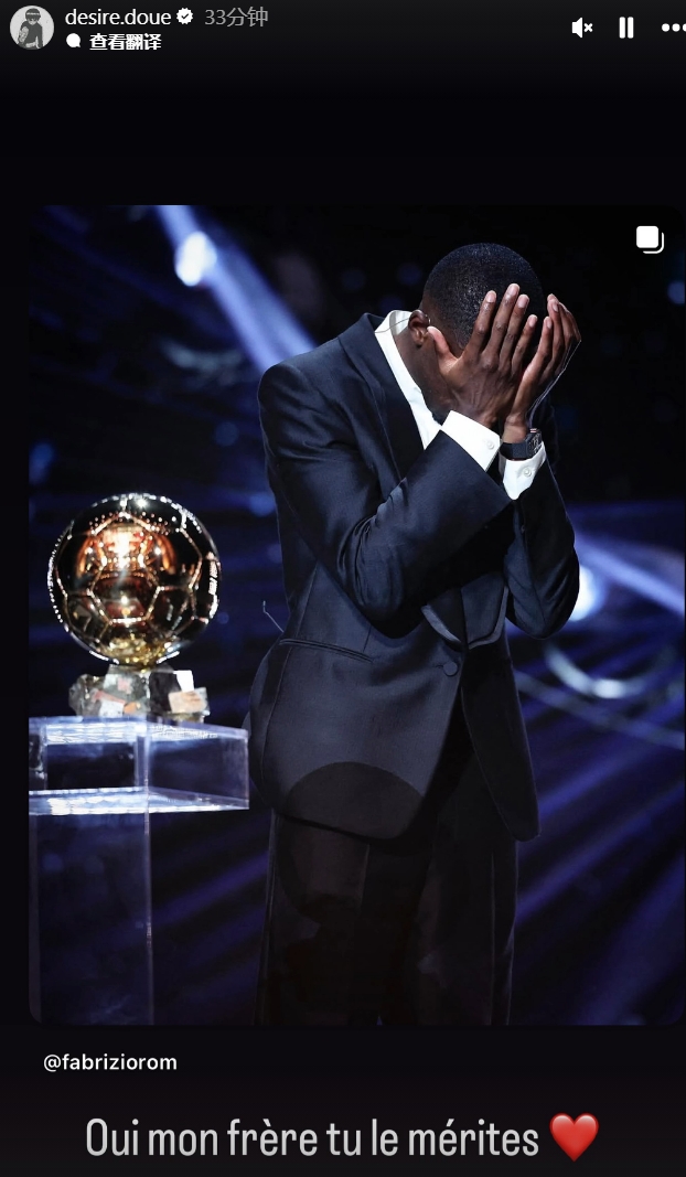 9月23日讯 在登贝莱获得2025年金球奖后,他的队友杜埃通过社交媒体祝贺了他。