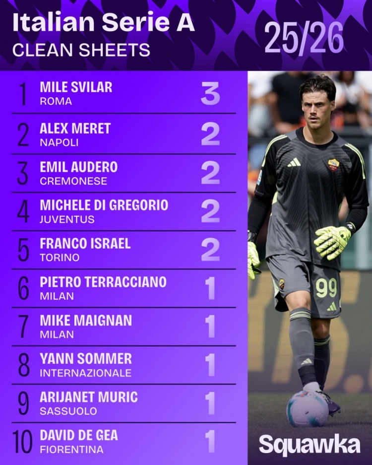 在本赛季的意甲职业联赛 中,斯维拉尔已经3次零封对手,排名第一。