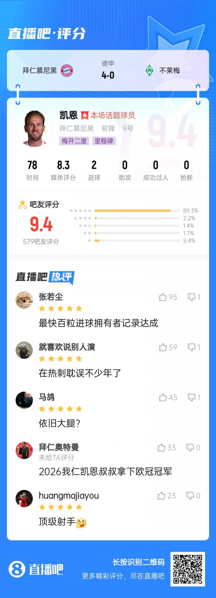 第五轮评选结果结出炉,凯恩连进两球斩获个人拜仁百球,帮助拜仁4-0击败不莱梅,苏超直播在线观看获得吧友4万多票支持,当选【X小红书德甲第5轮最佳球员】!