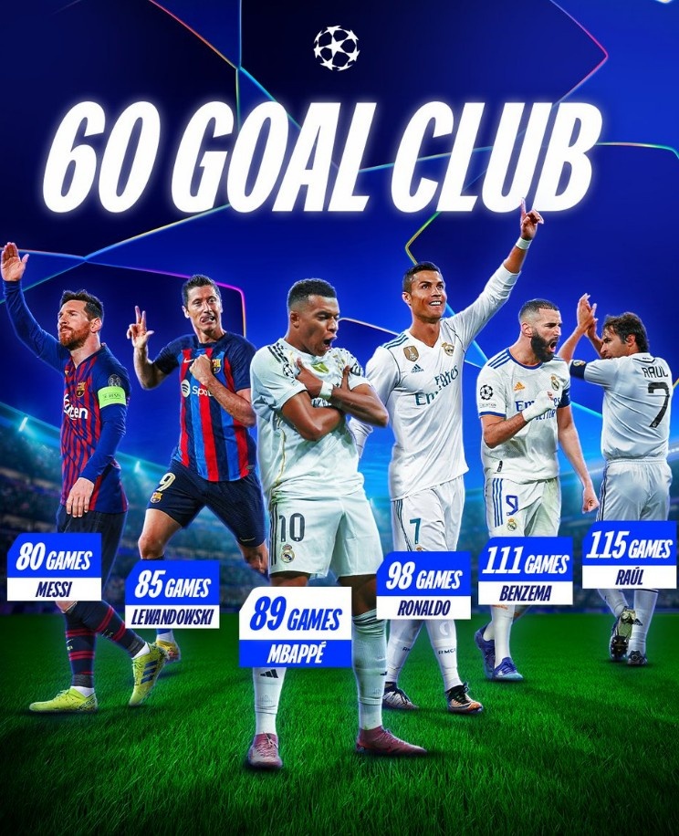 欧冠官方也盘点了历史上打进欧冠60球最快用时场次榜,具体如下: