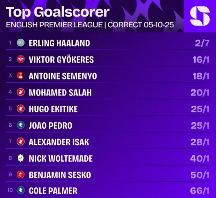 哈兰德成为本赛季英超金靴的大热门,这也反映在赔率上,因为挪威射手夺得英超金靴的赔率仅为2/7。