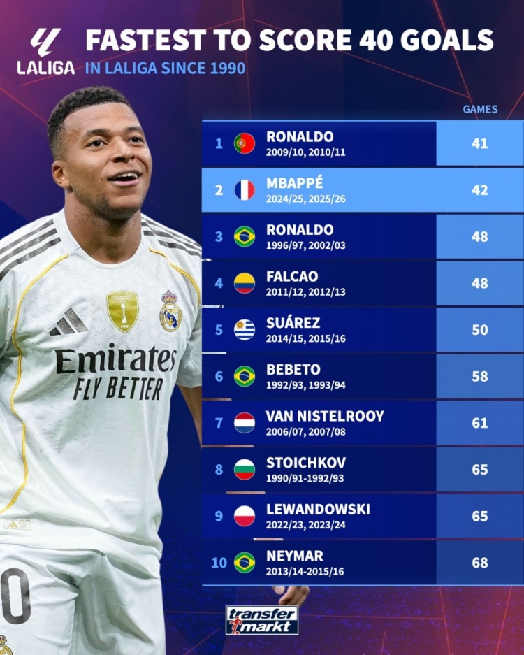 10月8日讯 德国转会市场列出了1990年以来最快达成西甲40球榜单,C罗41场居首,苏超在线直播高清视频无插件姆巴佩42场次席。