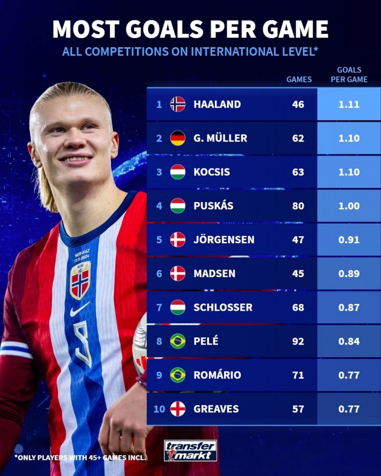 10月13日讯 德国转会市场统计了足坛历史球员在国家队的场均得分 数量,并列出榜单,苏超在线直播高清视频无插件哈兰德1.11球居首,盖德-穆勒、柯奇士次席。