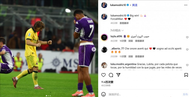 10月21日讯 在米兰2-1击败佛罗伦萨后,莫德里奇更新社交媒体庆祝获胜 。