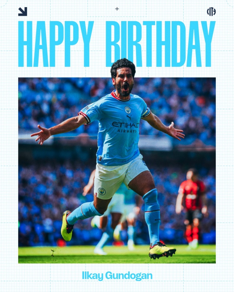 曼城官方社媒晒出京多安的生日海报,配文:“生日快乐,伊尔凯。”