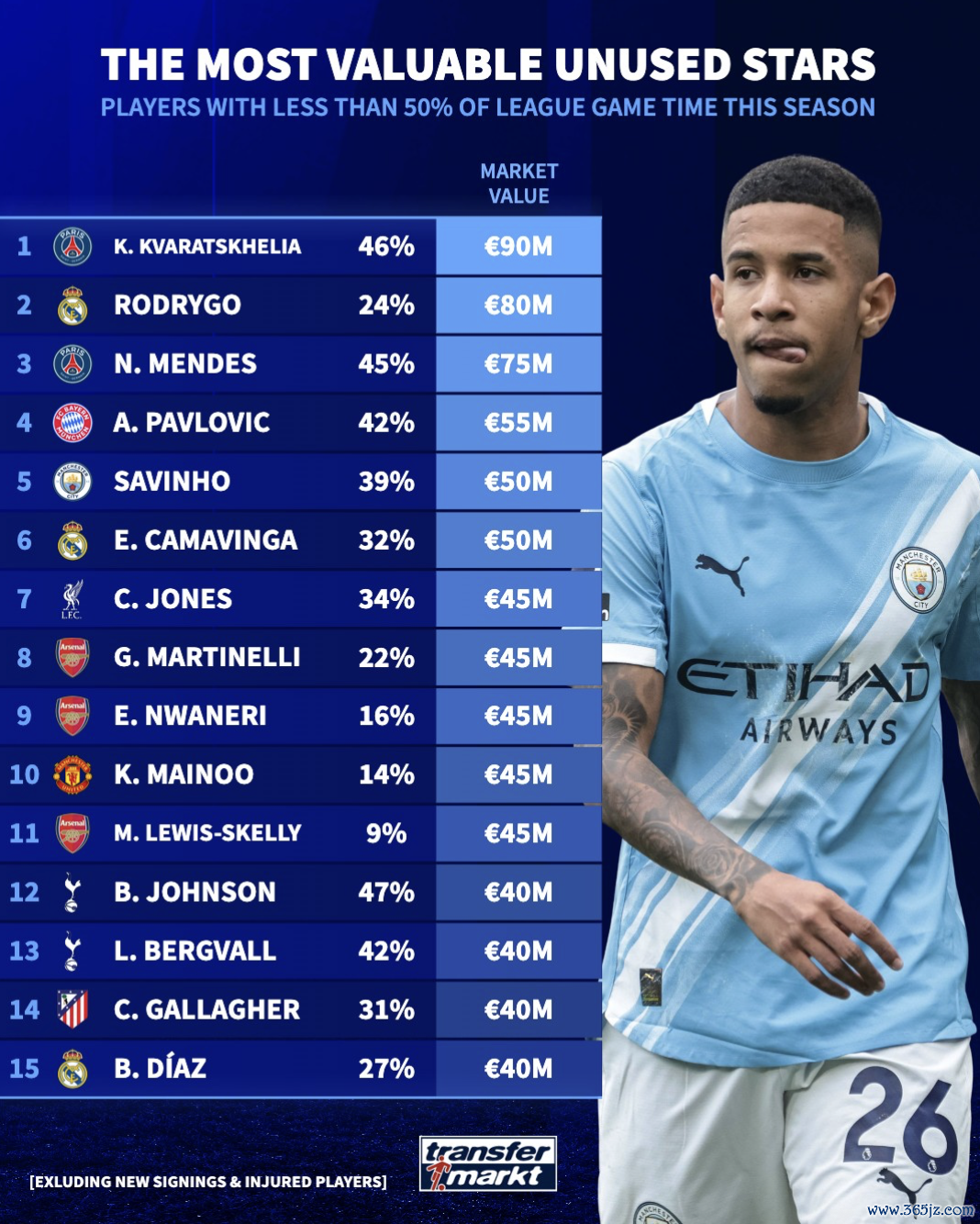 5.萨维尼奥(曼城):39%出勤率;5000万