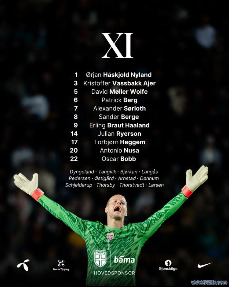 挪威杆位:1-尼兰德、3-阿耶尔、5-沃尔费、6-帕特里克·伯格、7-瑟尔洛特、8-桑德·博格、9-哈兰德、14-莱尔森、17-赫格姆、20-努萨、22-奥斯卡·鲍勃