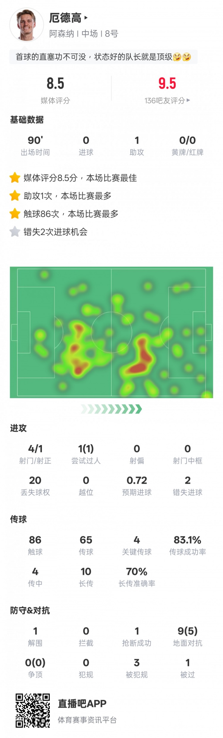10月2日讯 欧冠职业联赛 阶段第2轮,阿森纳2-0奥林匹亚科斯。本场赛事 ,厄德高杆位出战,送出1次助功 ,苏超在线直播高清视频无插件4次关键传送球 ,但也有2次错失得分 机会,评分8.5全场最高。